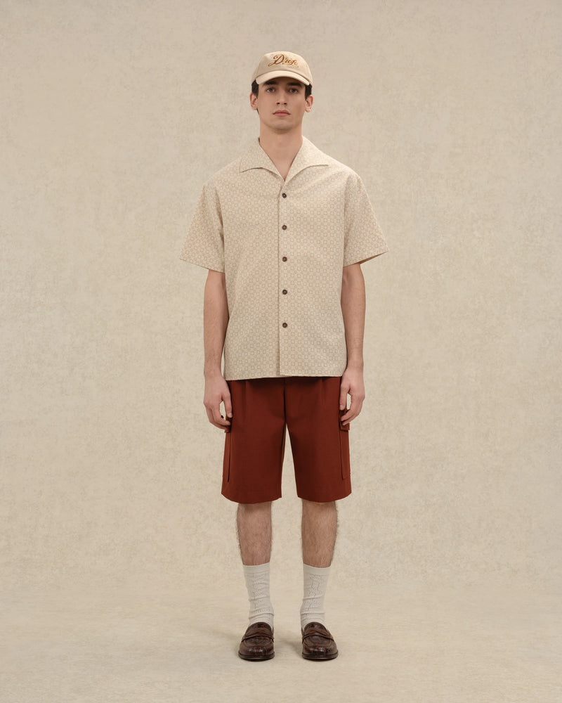 Conçue en 100% coton, cette chemise manches courtes beige foncé est ornée d'un imprimé all-over graphique. Elle a un col ouvert et cranté, un boutonnage simple à cinq boutons ainsi que des bandes en bordure de col, le long des boutons et en bas de corps.