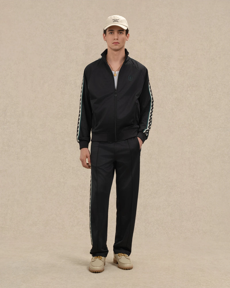 Cette veste de survêtement en double interlock de coton mélangé noir est ornée d'une broderie "D" réfléchie sur la poitrine et d'une bande d'épaule tressée contrastée. Elle présente un col montant, deux poches passepoilées zippées, une fermeture zippée centrale gravée et des finitions côtelées.