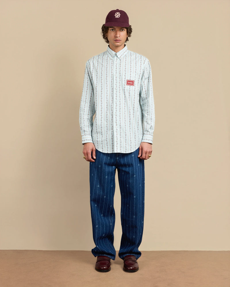 Cette chemise bleu clair 100% coton est ornée d'une étiquette tissée "Drôle" sur la poche plaquée à l'avant. Elle a une patte de boutonnage américaine, un empiècement au dos, des poignets boutonnés, un bas liquette et six boutons gravés à l'avant.