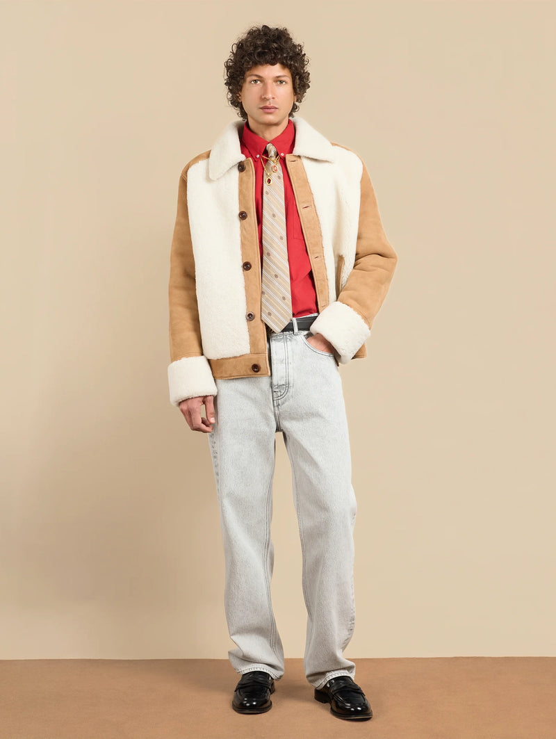 Ce blouson beige en shearling 100% cuir est orné de finitions en peau lainée sur le col, à l'avant et sur les poignets. Il présente cinq boutons à l'avant et deux poches raglan.
