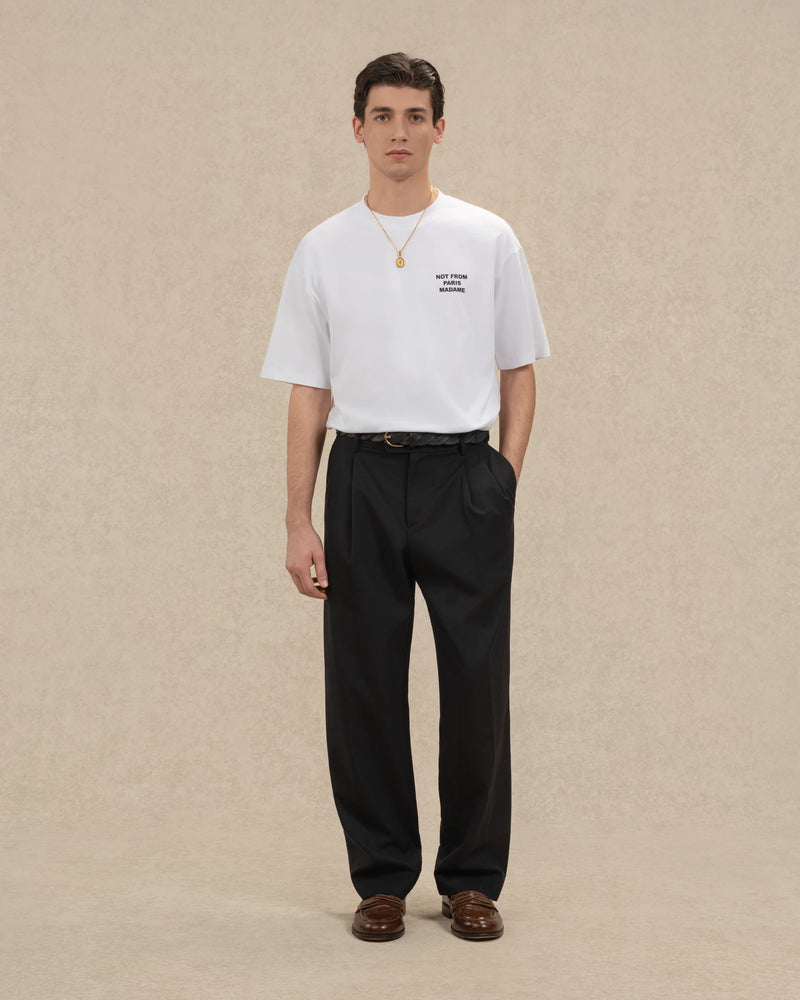 Ce pantalon noir à deux plis en laine mélangée dispose de deux poches latérales, de deux poches passepoilées au dos, d'un passant de ceinture personnalisé et d'une fermeture éclair et clip.