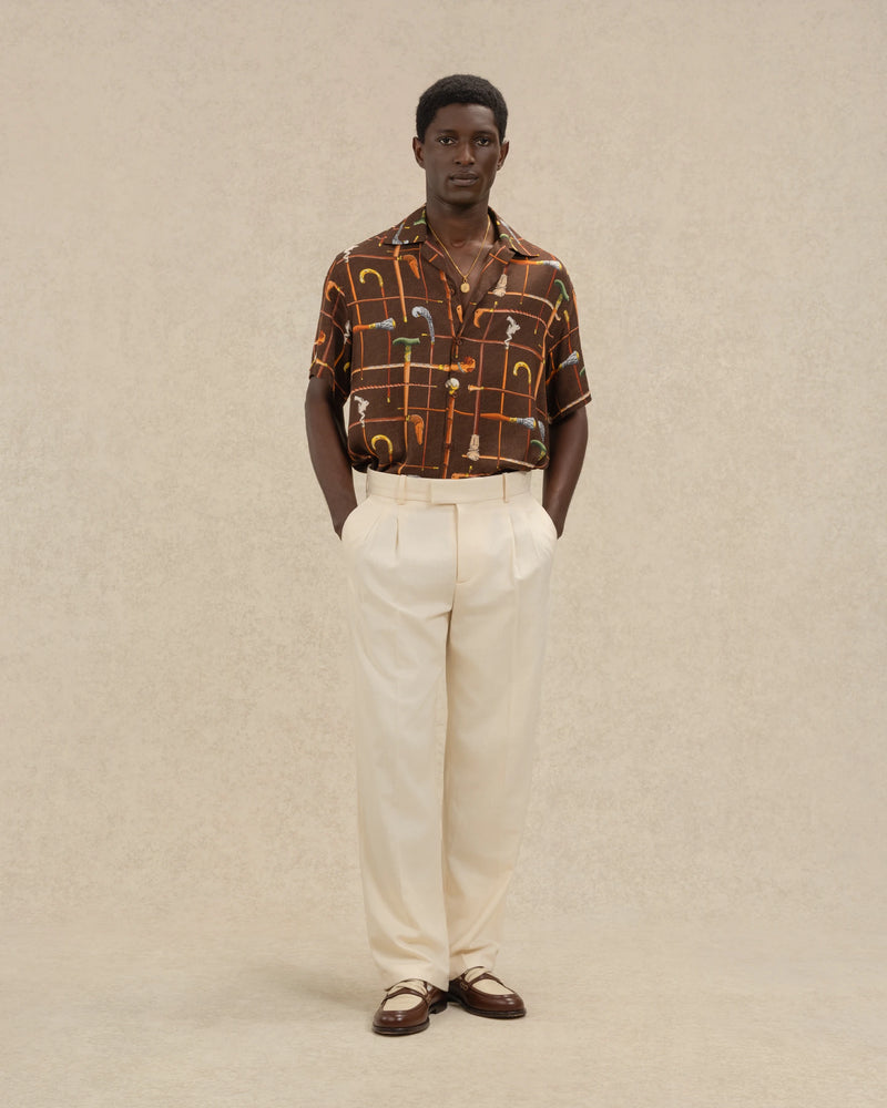 Ce pantalon golfeur 2 plis blanc cassé présente deux poches italiennes, deux poches passepoilées au dos, une hausse de ceinture personnalisée, une fermeture zip et agrafe, une broderie "Drôle" sur la ceinture et une doublure en viscose jusqu'aux genoux.