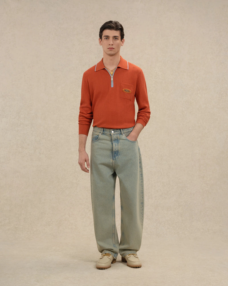 Ce polo manches longues rouge brique en coton mélangé présente un col chemise avec une demi-fermeture zippée et une poche plaquée avec une broderie Drôle Cigare.