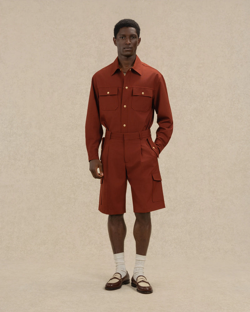 Conçu en laine mélangée, ce short cargo rouge brique présente des poches italiennes avec pressions "D" miroir, des poches passepoilées au dos, des poches plaquées à rabats avec pressions "D" miroir, une hausse de ceinture personnalisée et une fermeture zip et agrafe.