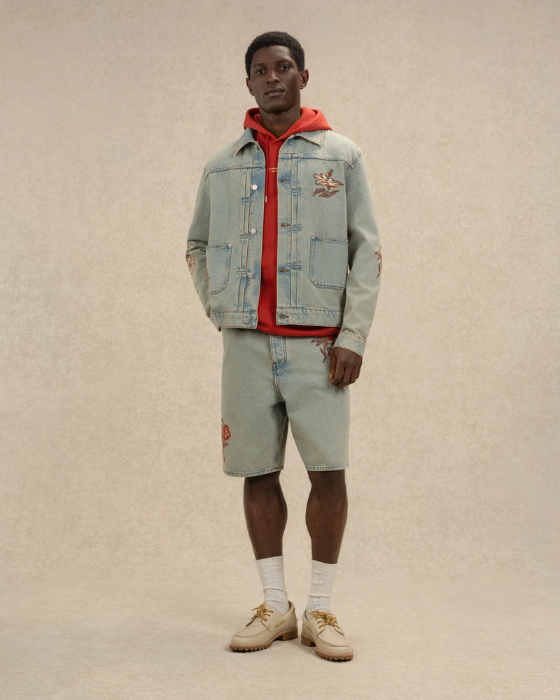 Cette veste en denim 100% coton à effet dusty est ornée de broderies fleurs et d'un patch en cuir au dos. Elle a six boutons denim gravés à l'avant, un col chemise, deux poches raglan et des pattes de serrage à la taille.
