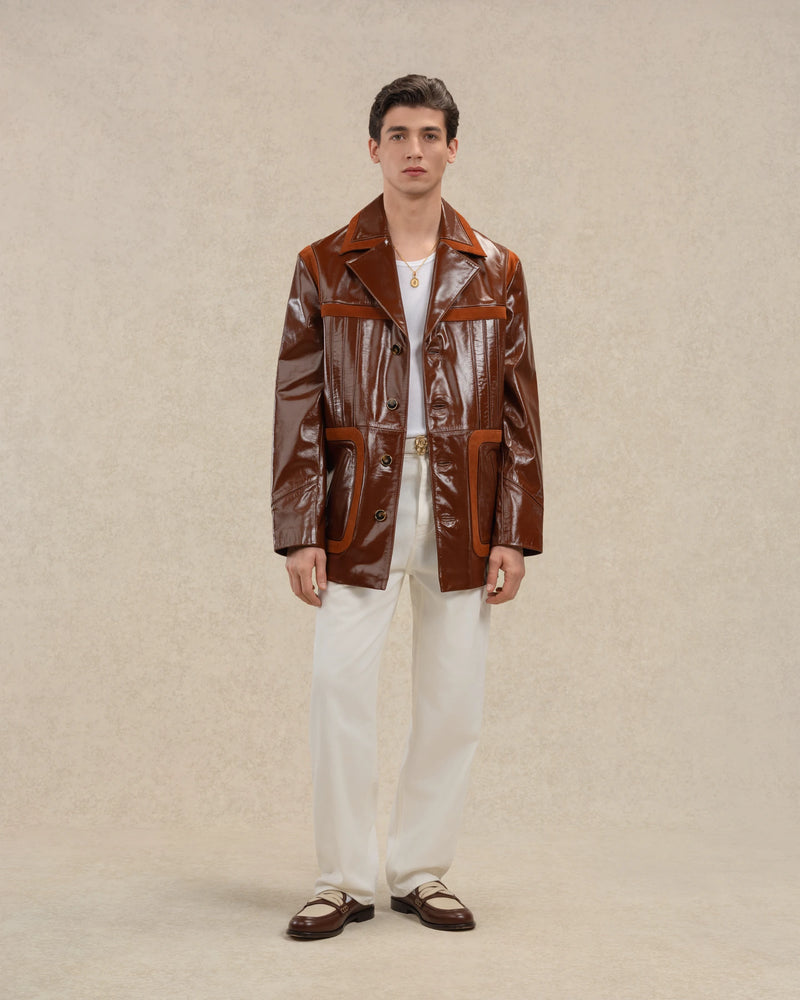 Cette veste saharienne marron 100% cuir est ornée de bandes en suède sur les contours de poche, le col et les empiècements. Elle a un col tailleur, un boutonnage simple à quatre boutons, une fente au dos et une poche passepoilée intérieure.