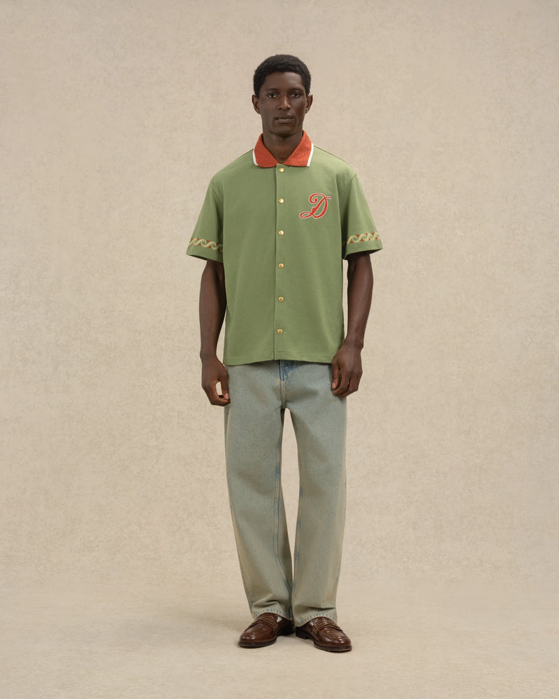 Made from 100% cotton, this water green short-sleeved shirt features a Vagues embroidery on the sleeves, a 'D' Cuba embroidery on the chest, and a Drôle Cuba embroidery on the back. It has a shirt collar and a single-breasted five-button closure.