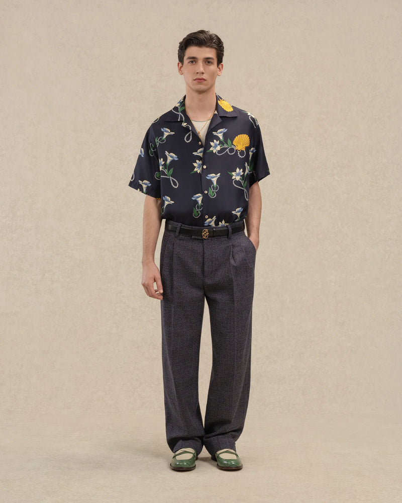 This navy blue short-sleeved shirt, made from 100% silk, features an all-over Coquillages print. It has an open collar, a loose fit, and five engraved buttons at the front.