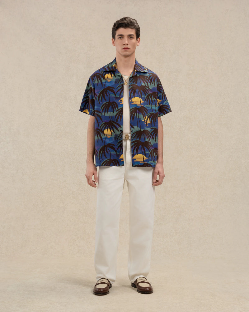 This navy 100% cotton short-sleeved shirt features an all-over Palmiers print. It has an open collar, a loose fit, and five engraved buttons at the front.
