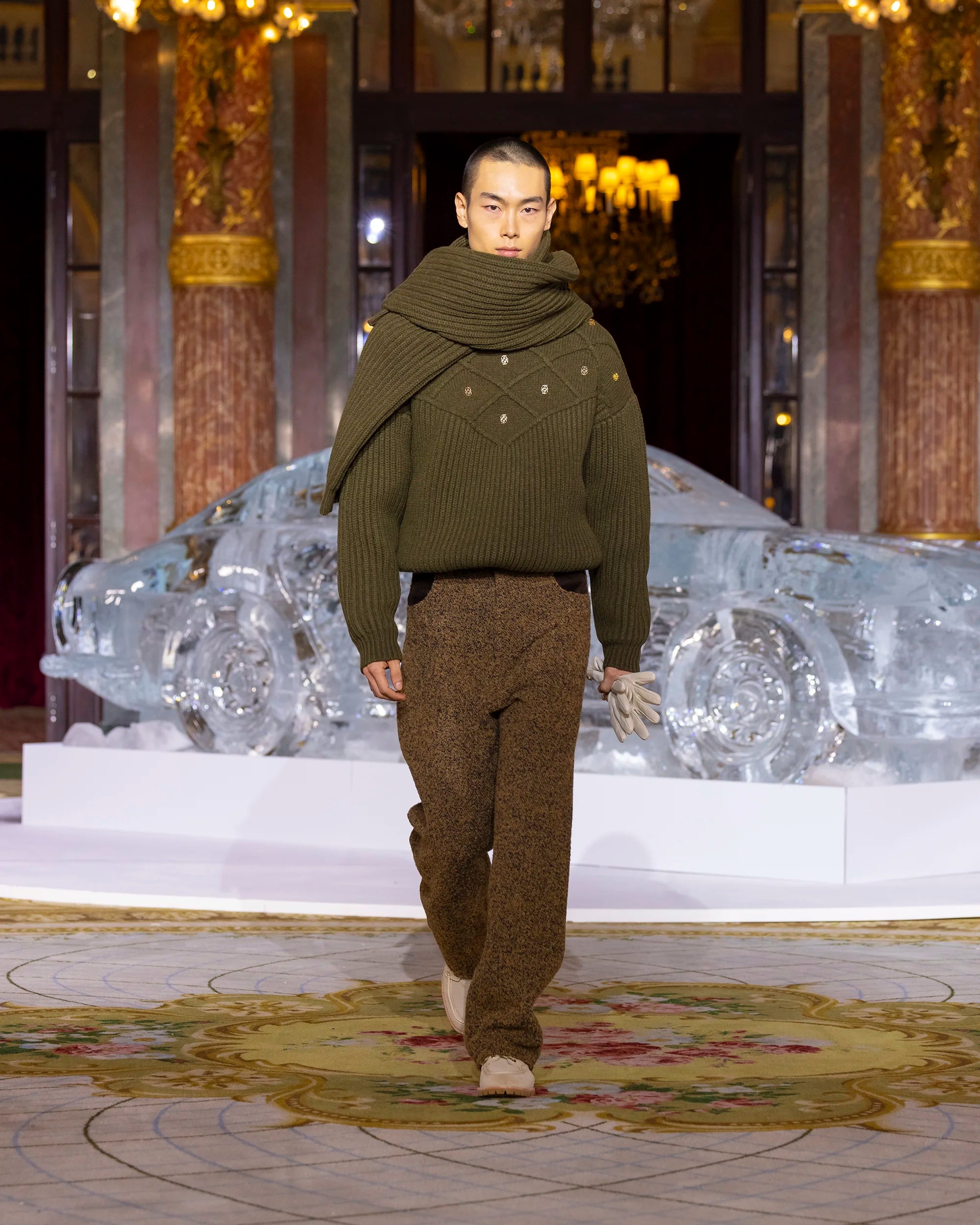 This kaki 100% wool ribbed knit sweater features contrasting 'D' mirror embroideries on the chest. A mix of diamond knit and chunky knit,