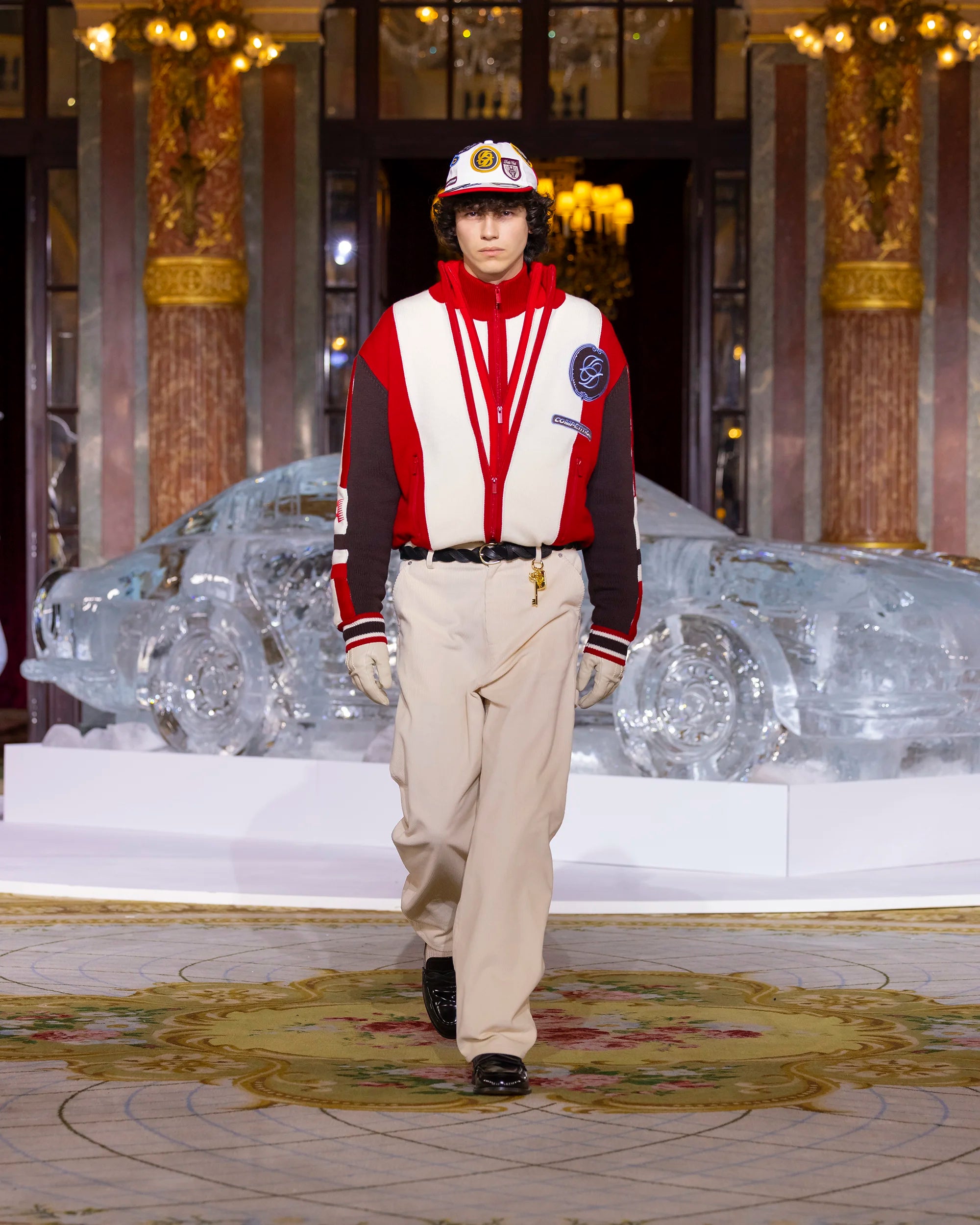 It features a stand-up collar, low armholes, striped panels on the front, tricolor stripes on the sleeves, mirrored 'D' and Ski Competition knit patches on the chest, and a Drôle Club Slogan jacquard knit patch on the back. It has a zip closure and two zipped front pockets, along with striped ribbed cuffs and hem.