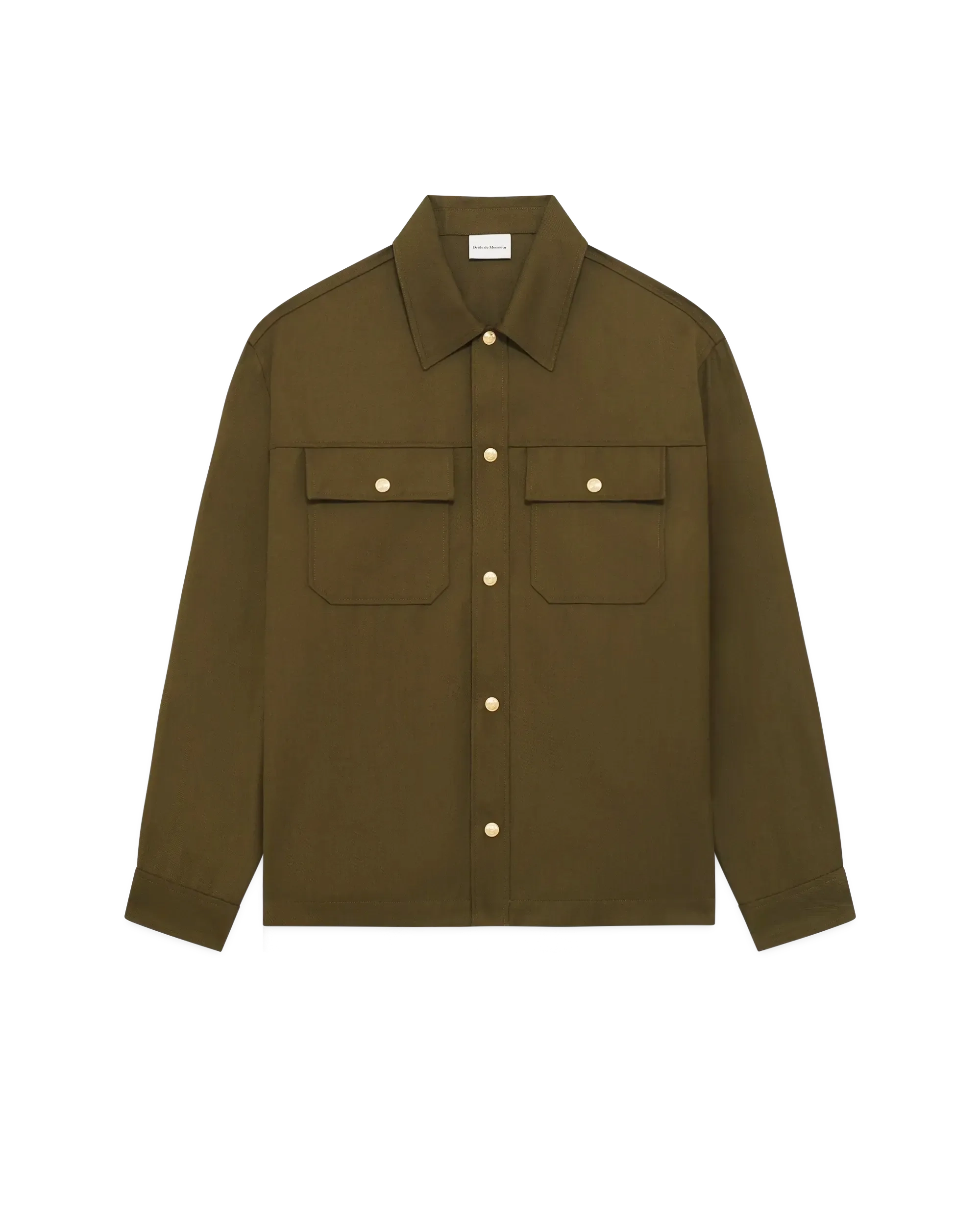 This khaki wool blend overshirt has two flap pockets on the chest, buttoned cuffs and five 'D' mirror snap buttons on the front.