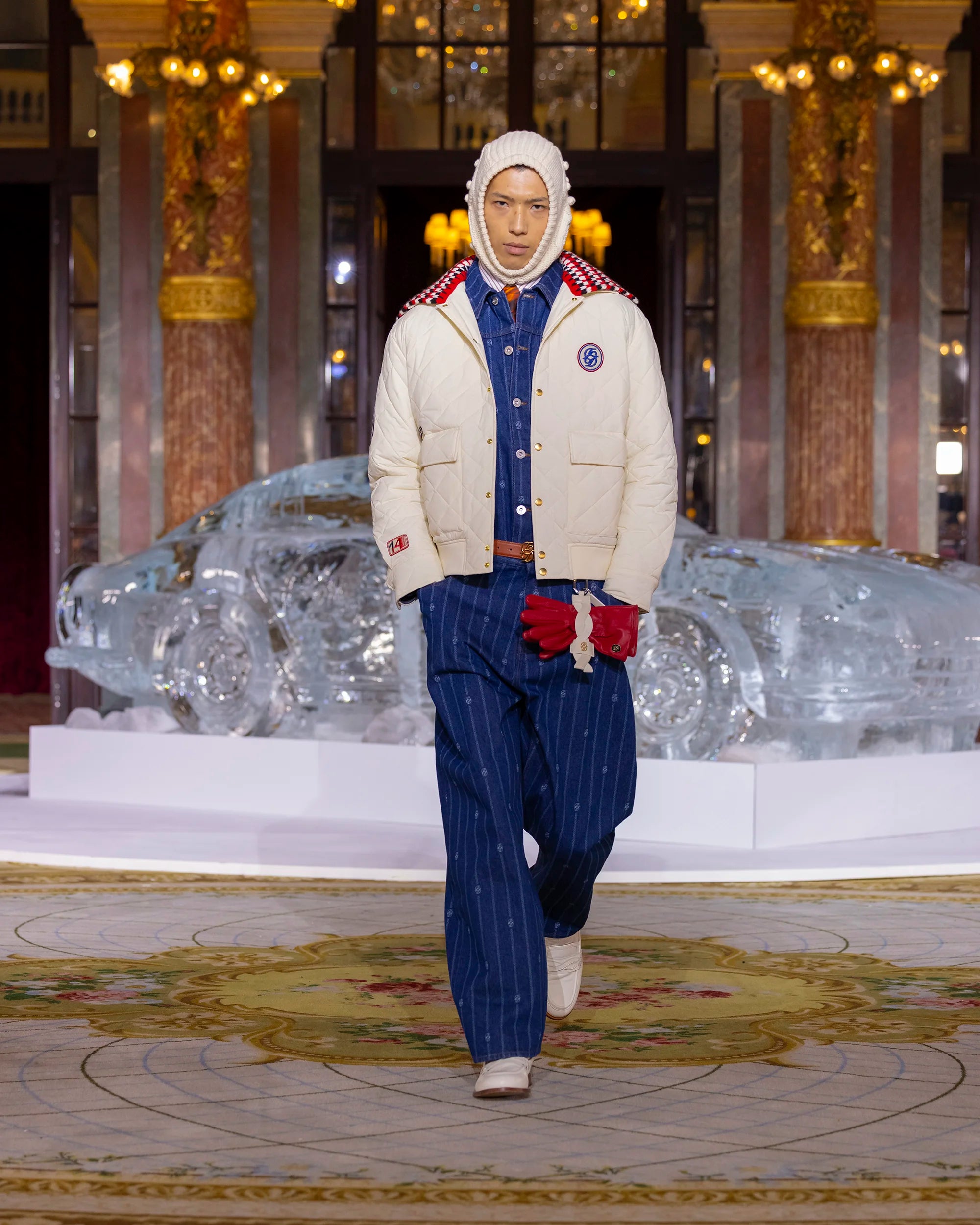 This off-white quilted jacket features a removable tricolor knit collar, a 'D' mirror patch on the chest and Racing patches on the front, sleeves and back. It has engraved snap buttons, two flap pockets with hidden snaps and side openings, a ribbed hem and cuffed sleeves with snap buttons.