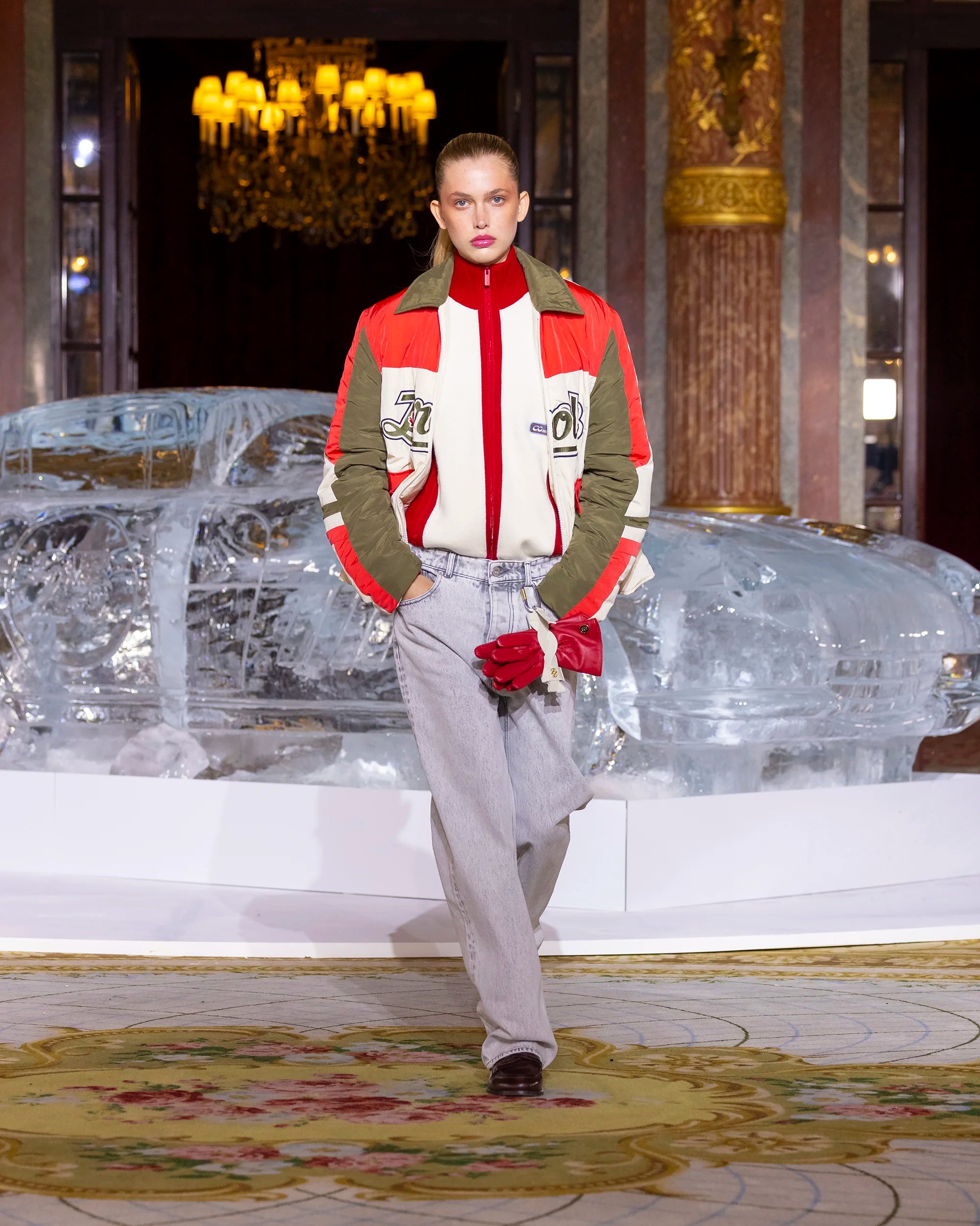 This red, cream, and khaki padded jacket features an embroidered 'Drôle' patch on the chest. It has two contrasting flap pockets and a two-way zipper.