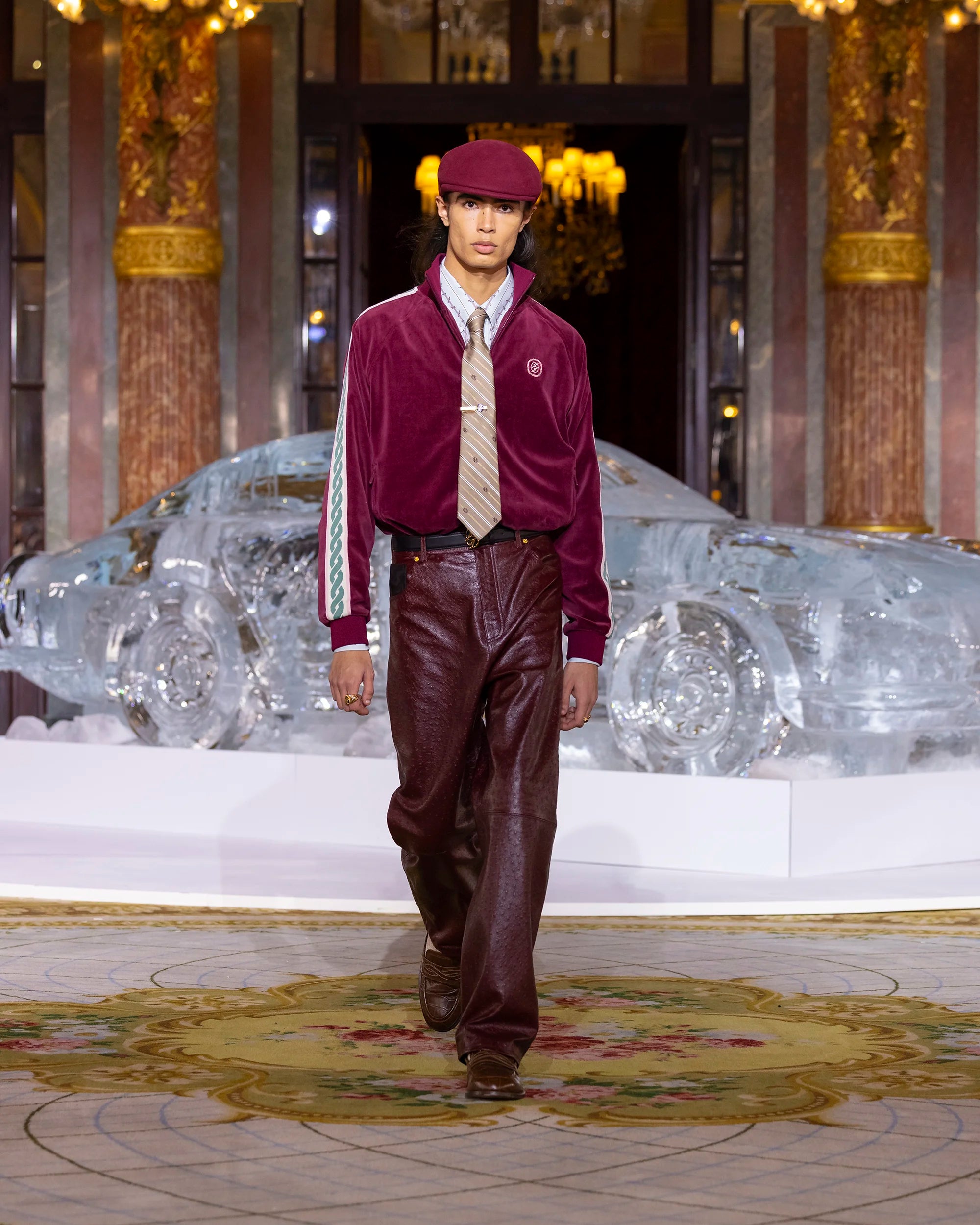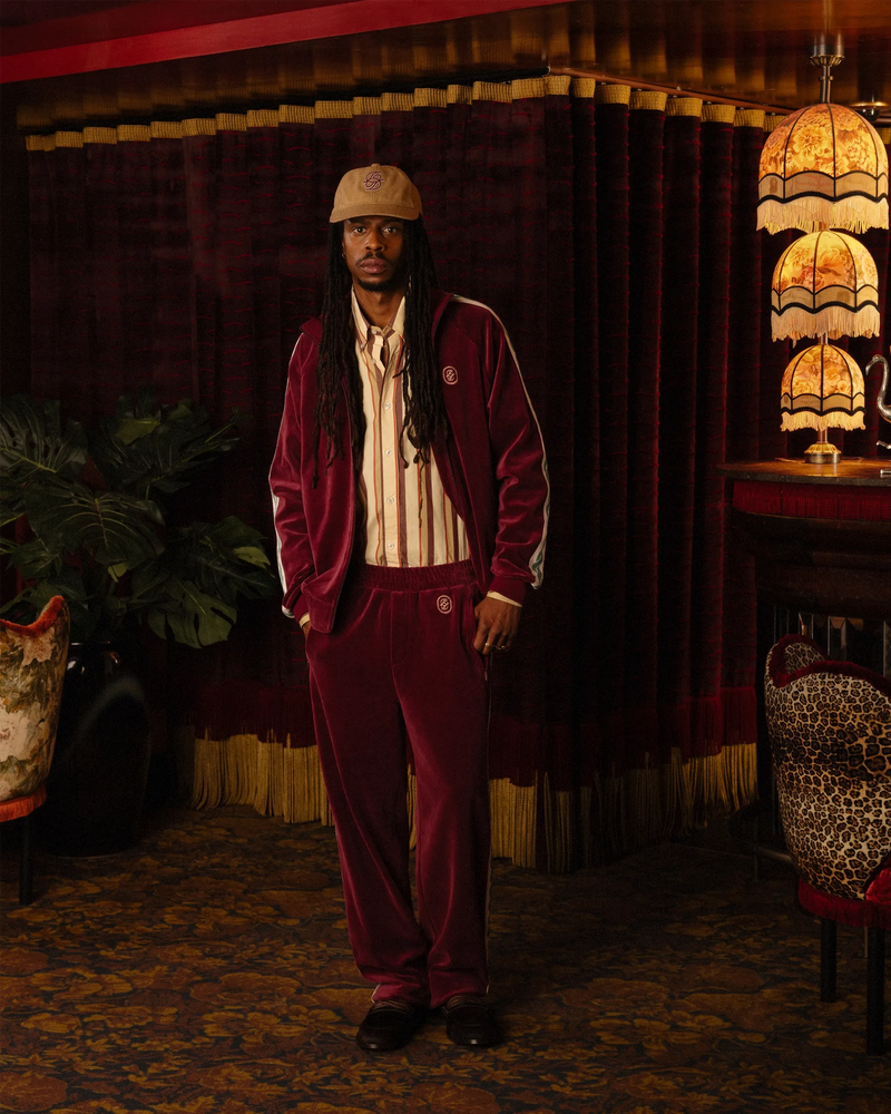 This wine cotton blend track jacket features a mirrored 'D' embroidery on the chest and braided piping on the sleeves. It has a high neck, two zipped pockets, an engraved front zip and ribbed finishes.