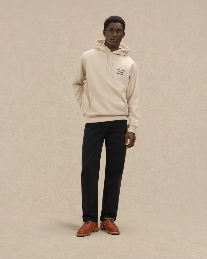 This beige 100% cotton French terry hoodie with ribbed hem and cuffs is printed with the 'Not From Paris Madame' slogan on the front and embroidered on the back.