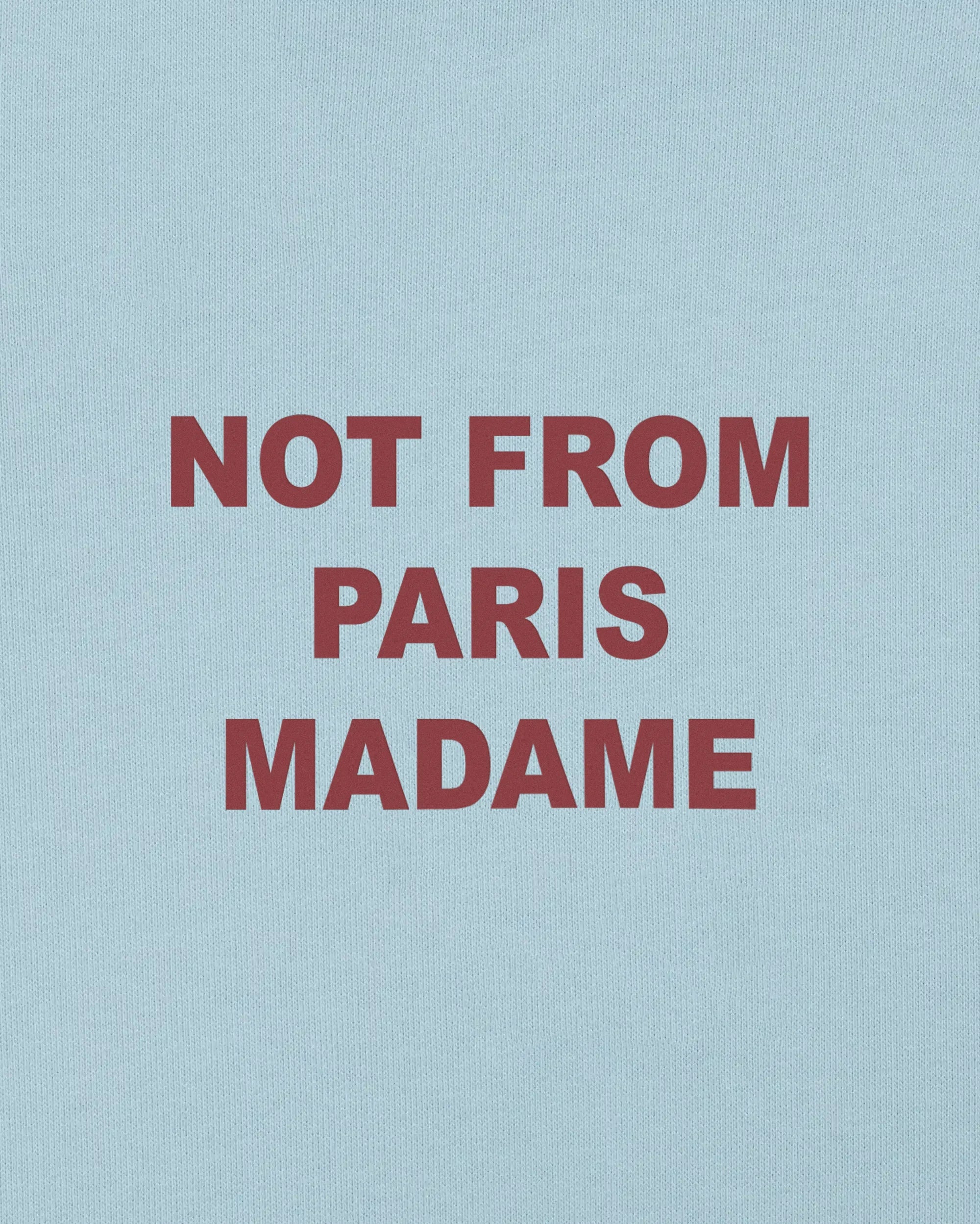This light blue 100% cotton French terry sweatshirt with ribbed hem and cuffs is printed with the 'Not from Paris Madame' slogan on the front and embroidered on the back.