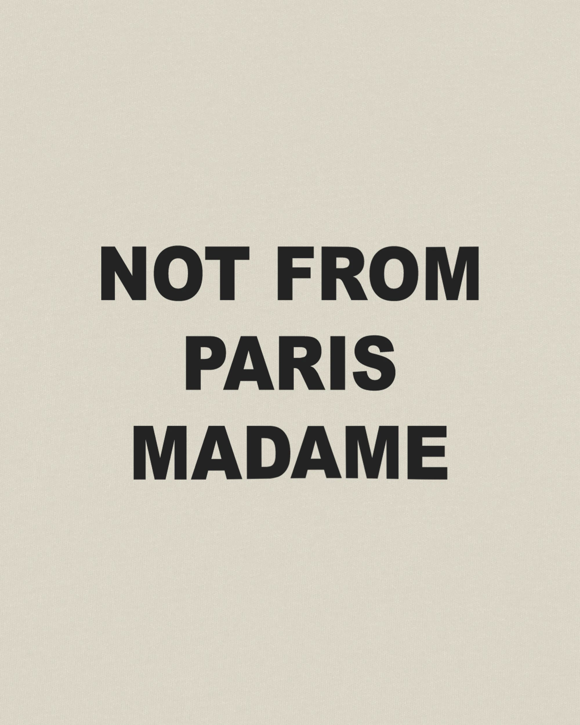 This beige 100% cotton French terry sweatshirt with ribbed hem and cuffs is printed with the 'Not from Paris Madame' slogan on the front and embroidered on the back.