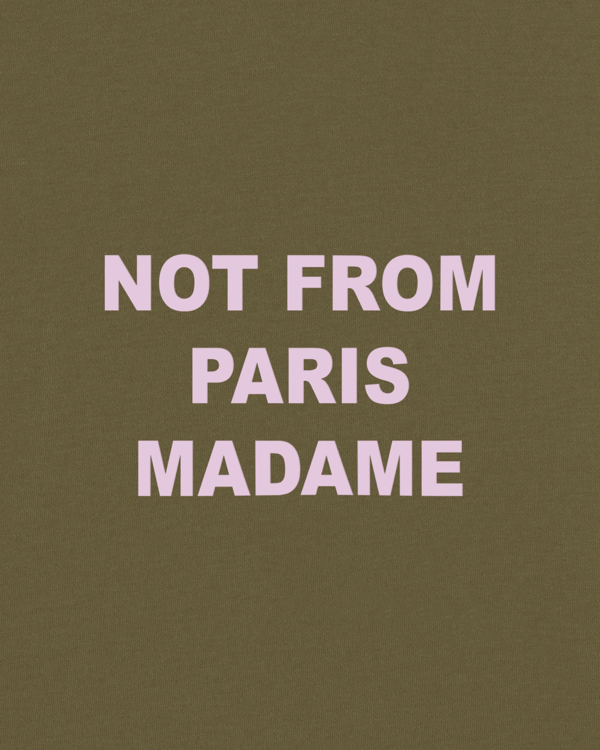 The Slogan tee. Made of 100% cotton interlock fabric, this kaki t-shirt features a ribbed neckline and the 'Not from Paris Madame' slogan printed front and back.
