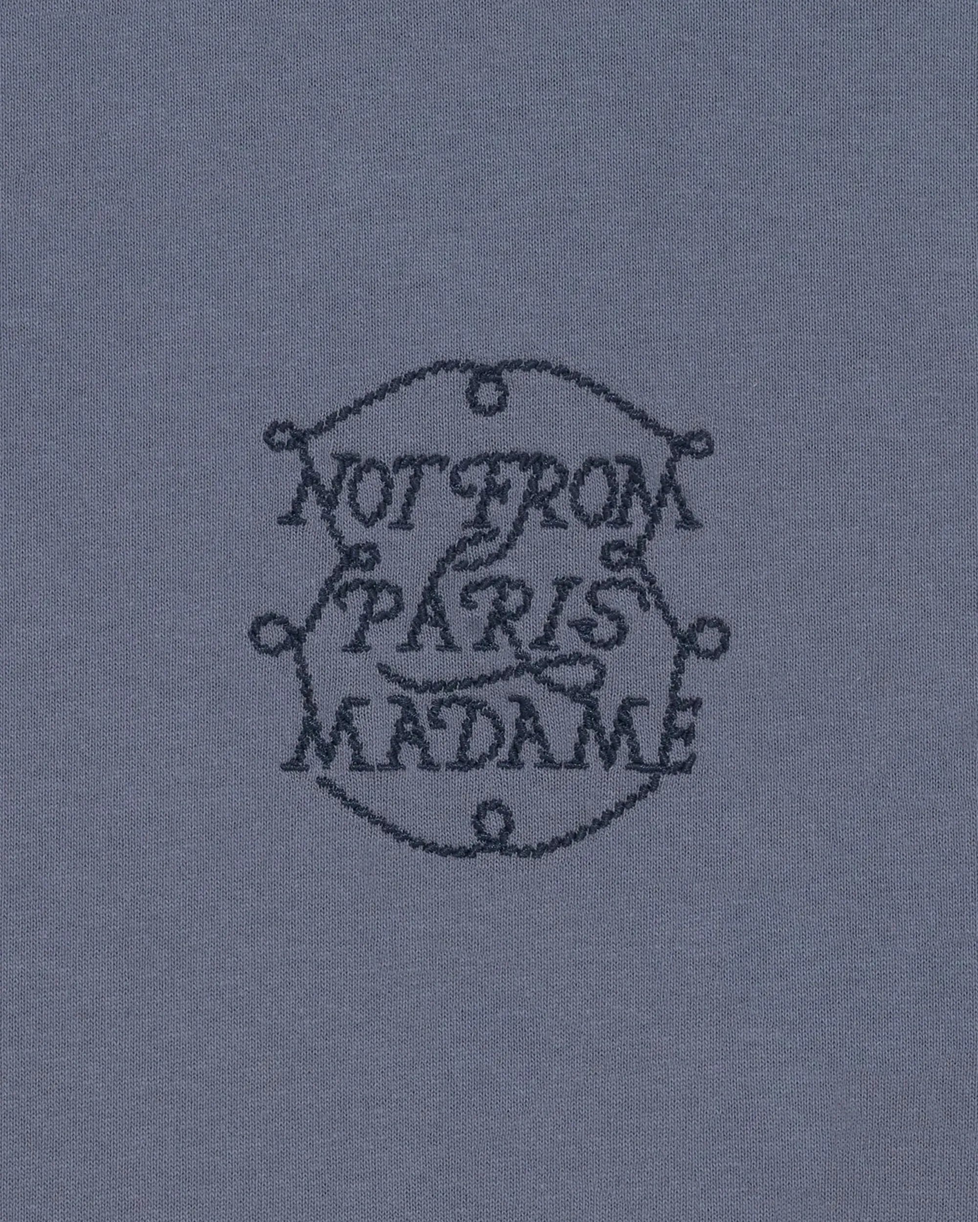 This slate blue 100% cotton jersey t-shirt with a ribbed neckline is embroidered with the Slogan Tresses pattern on the chest and back.