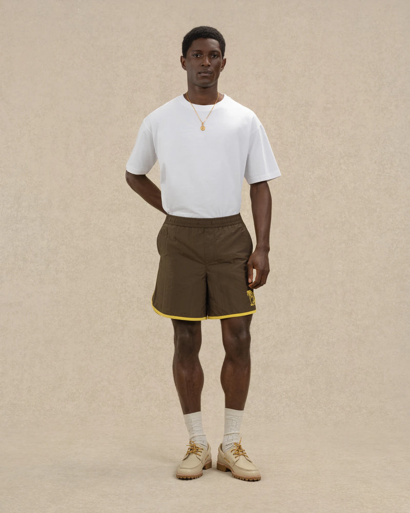 These khaki elasticated swim shorts feature a Plage embroidery on the front. They have two front Italian pockets, two welt pockets at the back, and bias-finished hems on the legs.