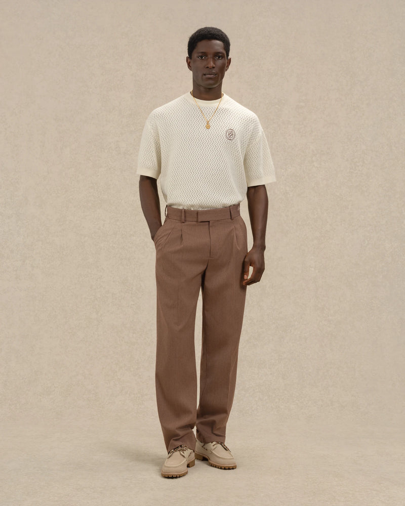 This off-white openwork knit t-shirt, made from 100% cotton, features a mirrored 'D' embroidery on the chest and a 'Drôle' label on the back.