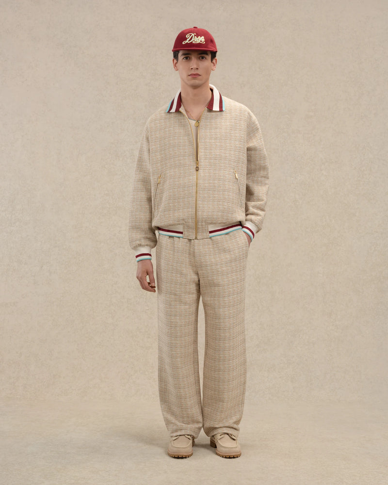Made from a cotton blend, this dark beige tweed track jacket is fully lined. It features a shirt collar in contrasting ribbed knit, contrasting ribbed and elasticated cuffs and hem, two zipped welt pockets, and a zip closure with a mirrored 'D' puller.