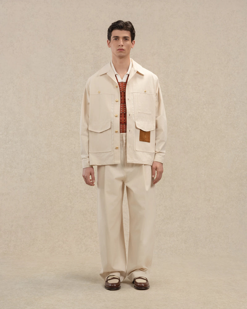 This off-white work jacket, made from 100% cotton, features patch pockets on the front, a leather pocket with a mirrored 'D' rivet, a single-breasted closure with five mirrored 'D' buttons, and a 'Drôle de Monsieur' label on the back.