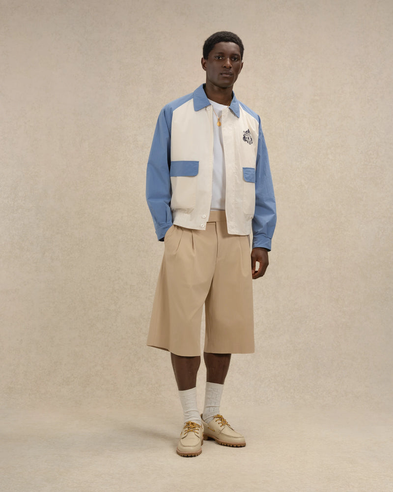 Made from a cotton blend, this off-white lightweight unlined jacket features embroidery on the front and back. It has a hidden central zip closure, three closure buttons, a shirt collar, two patch pockets, and elasticated hems at the waist.