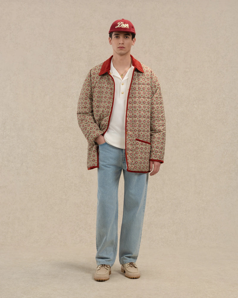 This reversible quilted jacket with a Cravate print features a mirrored 'D' embroidery and corduroy panels on the collar, front, pockets, and cuffs. With a loose fit, it has a 100% polyester filling, a shirt collar, dropped armholes, two patch pockets, and a closure with engraved snap buttons.