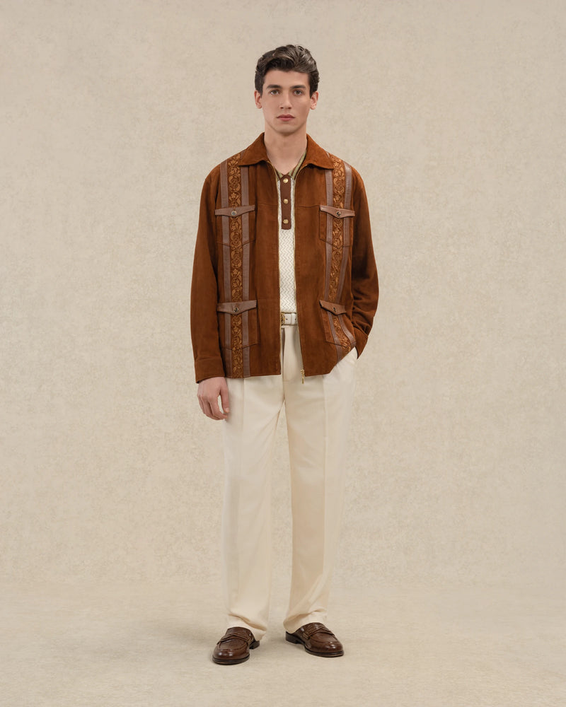 This brown suede jacket, made from 100% leather, is adorned with two vertical embroidered stripes. It features a shirt collar, a zip closure, four buttoned front pockets, and buttoned cuffs.