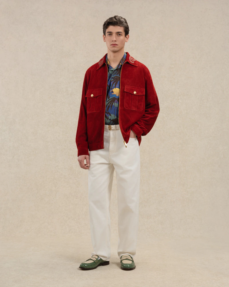 This dark red suede jacket, made from 100% leather, features a shirt collar, two buttoned patch pockets on the front, a zip closure, and leather patch detailing on the elbows, back, and collar.