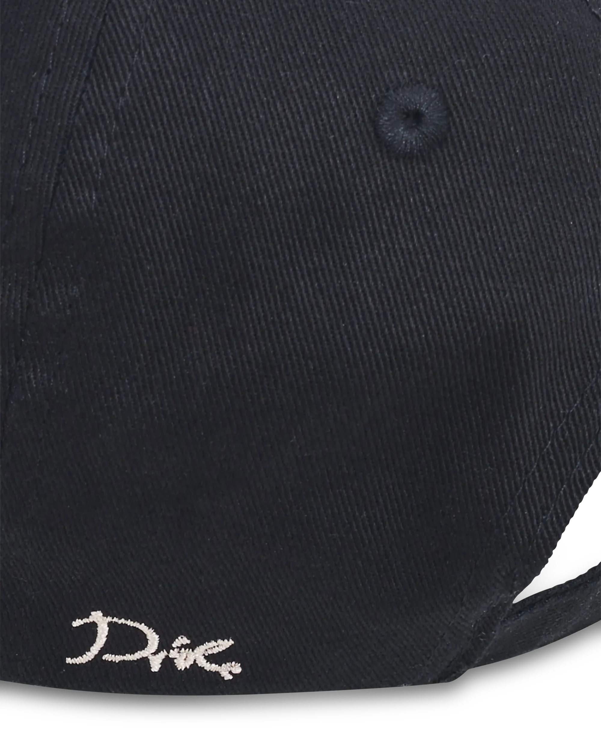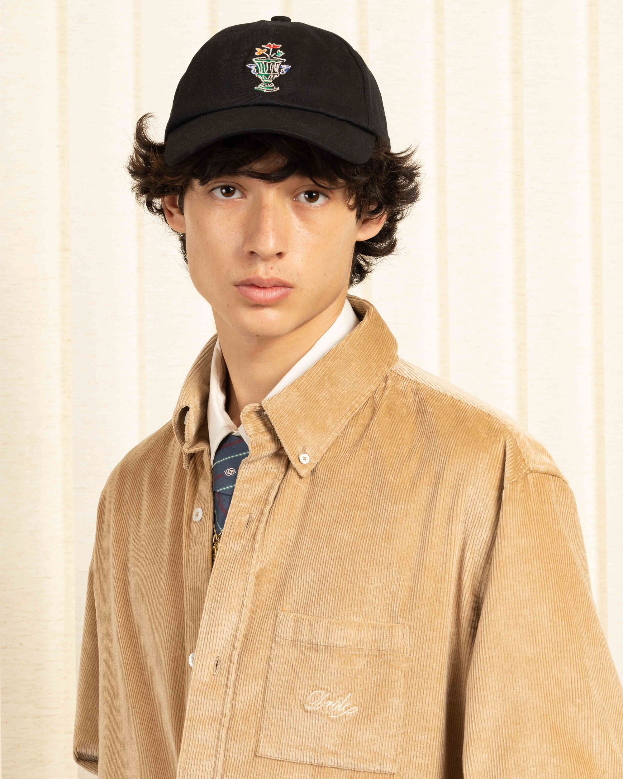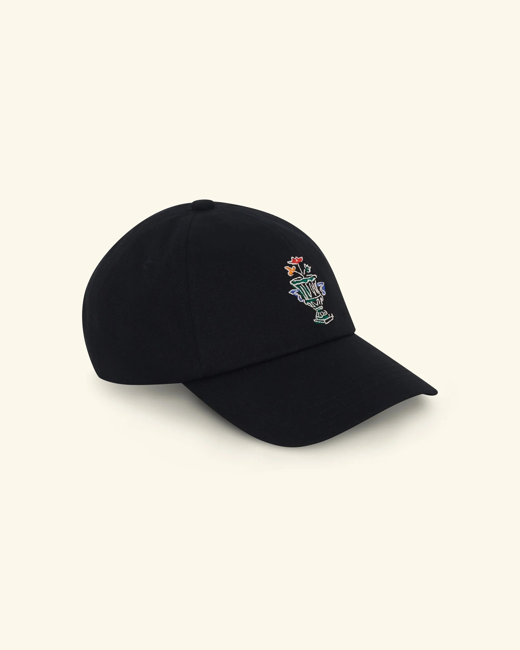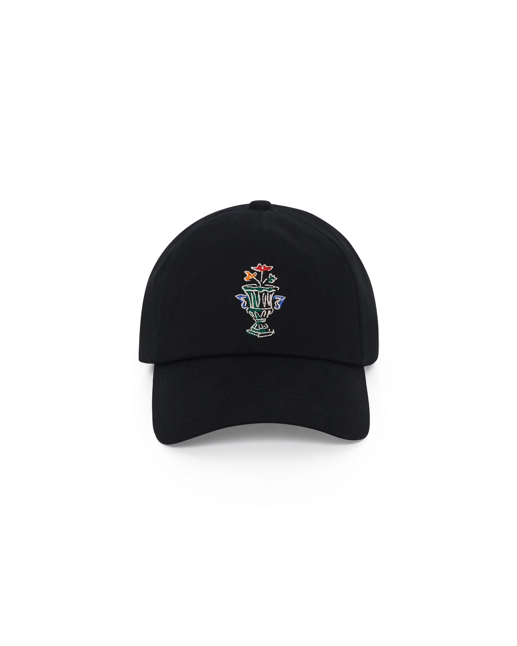 This black 100% cotton 6-panel baseball hat has an adjustable strap and an engraved 'Drôle' braided metal buckle. It is embroidered with the Vase pattern on the front.